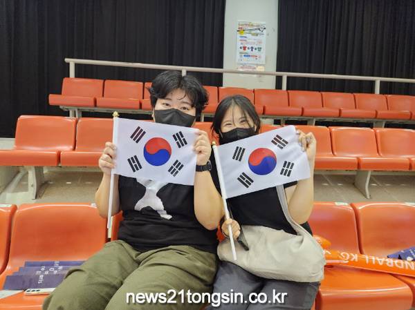 대한민국과 카자흐스탄의 여자 핸드볼 2024 파리 올림픽 아시아 예선이 펼쳐지고 있는 일본 히로시마 마에다 동구 하우징 스포츠센터에 태극기를 든 두 여성 팬이 등장했다. 대한민국 핸드볼을 향한 사랑으로 대한해협을 건너 히로시마까지 온 이수빈(26), 국경아(39) 씨가 그 주인공이다.