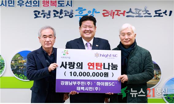 태백시는 강원남부주민(주)와 ‘하이원SC’태백시민(주)가 17일 저소득 가구와 소외계층을 위해 1,000만 원 상당의 연탄 및 난방유를 기부했다고 밝혔다.송재범 대표는 “난방비 부담으로 어려움을 겪는 취약계층에 도움을 주고 싶어 기부를 결정했다”고 전했다.윤인규 대표도 “지역 이웃들이 따뜻한 겨울을 보내길 바란다&rd...