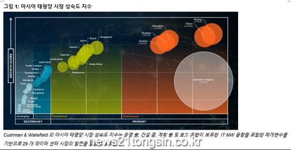 글로벌 부동산 컨설팅 업체인 쿠시먼앤드웨이크필드가 최근 ‘아시아 태평양 데이터 센터 업데이트’ 보고서를 발표하고 베이징, 상하이, 싱가포르, 시드니, 도쿄 등 5개 도시가 아시아 태평양 지역에서 운영되는 데이터 센터 용량의 62%를 차지하고 있고, 시드니와 도쿄도 상하이와 베이징과 함께 앞으로 1~2년 안에 운영 용량이 1기가와트(GW)를 초과하는 도시로 합류할 것으로 예상된다고 밝혔다.