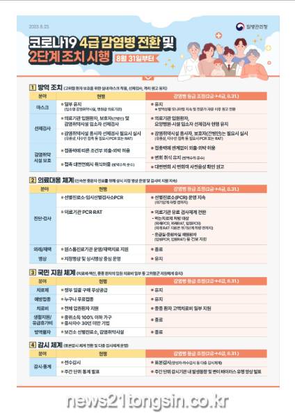 코로나19 감염병 등급이 4급으로 하향 조정되면, 지난 3월 발표한 위기단계조정 로드맵에 따른 2단계 조치가 시행된다. 다만, 고위험군 보호 및 안정적 대응체계를 위해 위기경보‘경계’ 단계는 당분간 유지한다.