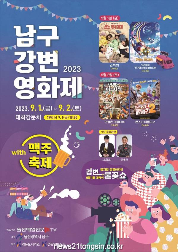 (뉴스21통신/최원영기자)=울산 남구(구청장 서동욱)는 9월 1일부터 2일까지 2일간 태화강 둔치 일원(태화교 옆)에서 ‘2023 남구 강변영화제’를 개최한다고 28일 밝혔다.