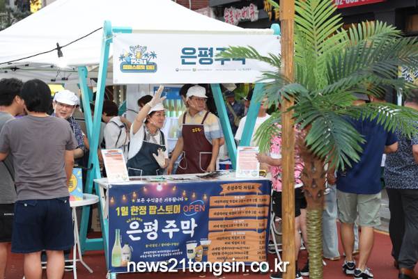 특히 지난 26일 오후 4시 반부터 2시간가량 김미경 은평구청장이 연신내상점가상인회와 협업해 먹거리부스인 ‘은평주막’을 운영했다. ‘은평주막’에서 김미경 구청장과 간부 공무원들은 청년 막걸리를 판매해 청년 기업을 홍보했다. 막걸리 판매 수익금은 전액 기부할 예정이다.