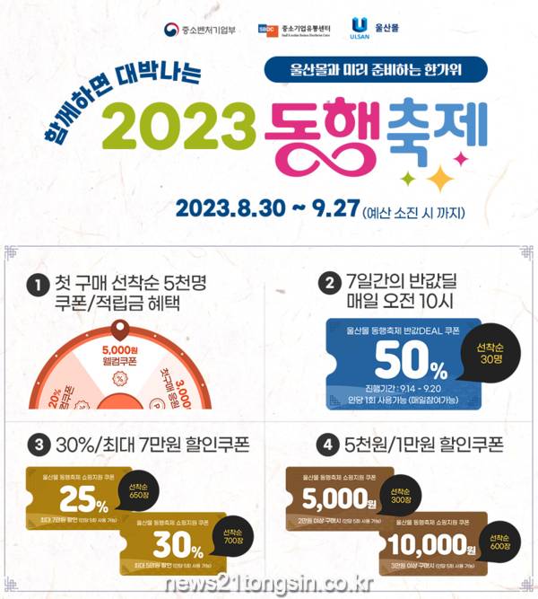 (뉴스21통신/우정석기자) = 울산시는 지역 소상공인 매출 증대와 소비 진작을 위해 전국 단위 대규모 할인행사인 ‘2023 황금녘 동행축제’와 연계해 울산몰과 울산페달 할인행사를 추진한다고 밝혔다.