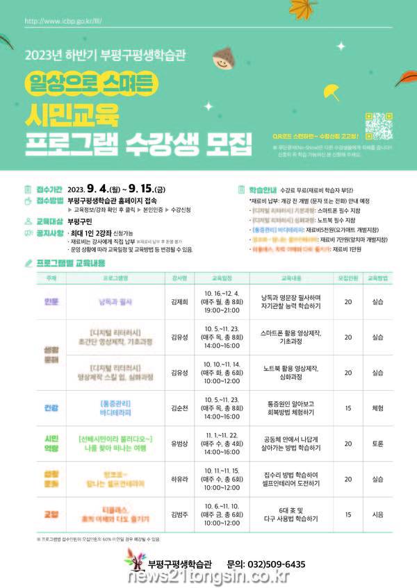 부평구(구청장 차준택) 평생학습관은 9월 4일부터 15일까지 ‘일상으로 스며든 시민교육 프로그램’ 하반기 수강생을 선착순으로 모집한다.