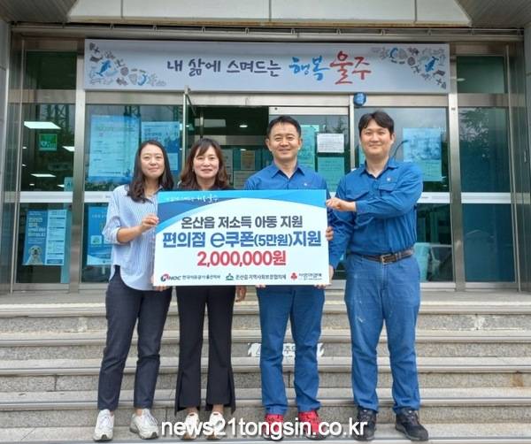 (뉴스21통신/우정석기자) = 한국석유공사 울산지사(지사장 김영철)가 31일 울주군 온산읍 행정복지센터에서 저소득 아동을 위한 200만원 상당의 편의점 모바일 교환권을 전달했다.