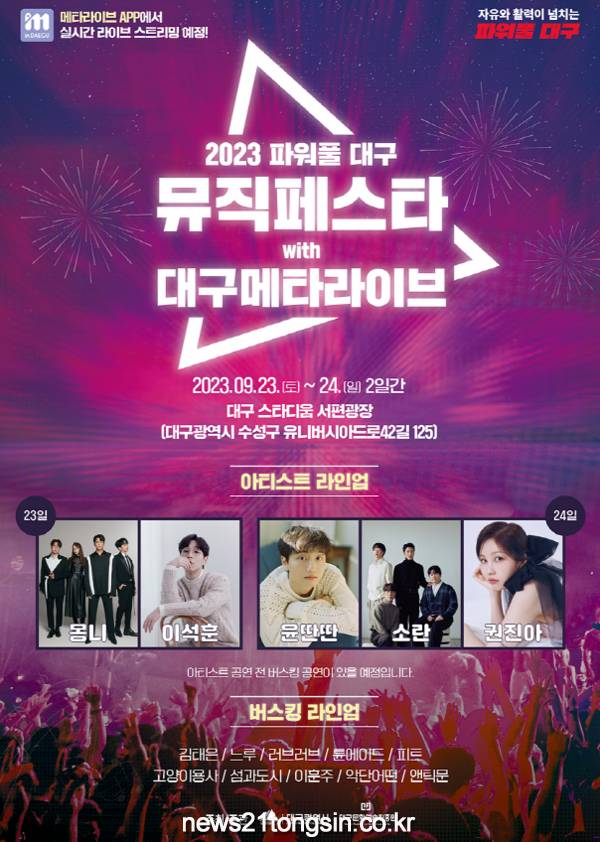 (뉴스21통신) 유재원기자 = 대구광역시는 오는 9월 23일~24일까지 2일간 「2023 파워풀대구 뮤직페스타」 콘서트를 대구메타라이브앱(온라인)과 대구스타디움 서편광장(오프라인)에서 동시 개최한다.