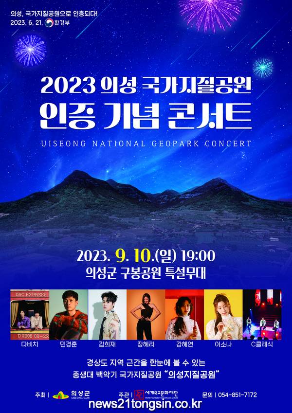 이를 기념하기 위해 다비치, 민경훈, 김희재, 장혜리, 강혜연, 이소나, C클래식 등 명불허전 출중한 가창력을 겸비한 가수들을 초청해 의성 국가지질공원의 가을밤을 수놓는다. 이번 공연은 오는 23일 오전 10시 반에 안동MBC TV를 통해 녹화방송 예정이다.
