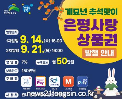 구는 높은 물가를 고려해 상품권 발행 규모를 늘리고자 구 예산을 추가로 투입했다. 이번 추석맞이 은평사랑상품권은 총 2회 발행된다. 1차는 오는 14일 오후 4시부터 1차 100억 원 규모로, 2차는 오는 21일 오후 4시부터는 28억 원 규모로 발행한다.