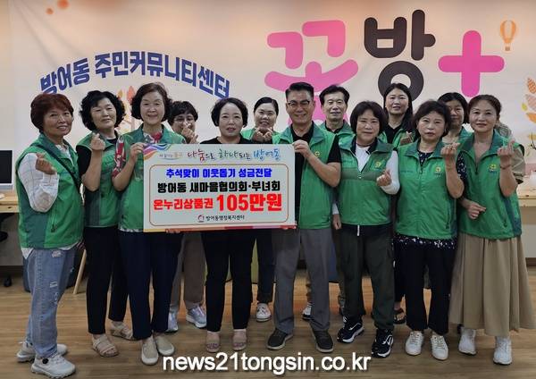 (뉴스21통신/임정훈기자) = 울산 동구 방어동 새마을협의회(회장 윤만석)·부녀회(회장 김정숙)는 9월 8일 방어동행정복지센터를 방문해 어려운 이웃들을 위해 써달라며 추석맞이 온누리 상품권 105만원을 전달했다.