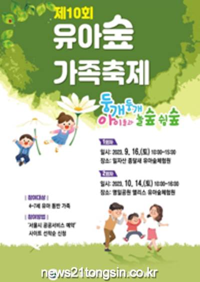 유아숲 가족축제는 9월과 10월에 하루씩 열린다. 9월 16일에 일자산 종달새 유아숲(둔촌동 562)에서, 10월 14일에는 명일공원 앨리스 유아숲(상일동 산26-9)에서 각각 진행되어 다채로운 숲의 매력을 경험해볼 수 있다. 축제는 ▲자연체험 ▲가족친화 ▲산림휴식 3가지 주제의 다양한 프로그램과 부대행사로 구성된다.