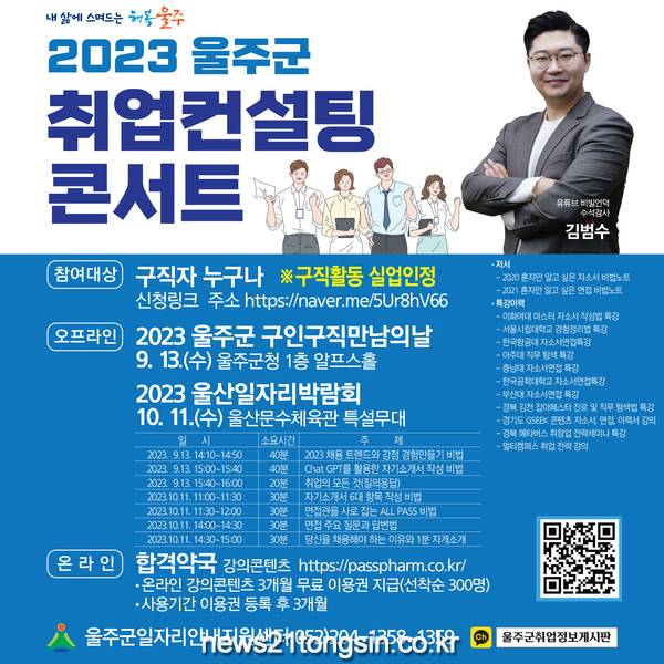 (뉴스21통신/우정석기자) = 울주군 일자리안내지원센터가 오는 13일 ‘2023 울주군 구인·구직 만남의 날’과 다음달 11일 ‘2023 울산 일자리박람회’ 행사에서 ‘2023 취업컨설팅 콘서트’를 개최한다.