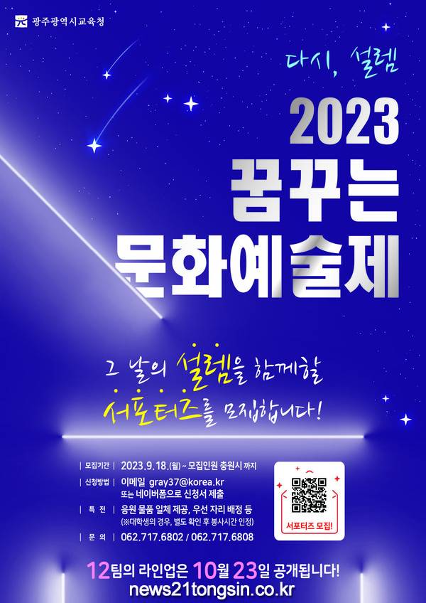 서포터즈는 특수교육대상학생과 가족, 학생, 교직원을 포함해 누구나 참여가능하다. 앞으로 행사의 조력자이자 참가자, 관객으로서 이번 축제에 함께하게 된다. 신청은 꿈꾸는 문화예술제 운영팀 이메일(gray37@korea.kr) 접수 및 누리집 접수(https://docs.google.com/forms/d/e/1FAIpQLSdUKUFo3hABgpTlThWLXMfae79dNLUCwWintEQpxG6V5F8jGg/viewform?pli=1)를 통해 가능하다. 선정 결과는 오는 10월 31일 광주특수교육지원센터 누리집과 학교로 안내된 공문을 통해 확인할 수 있다.