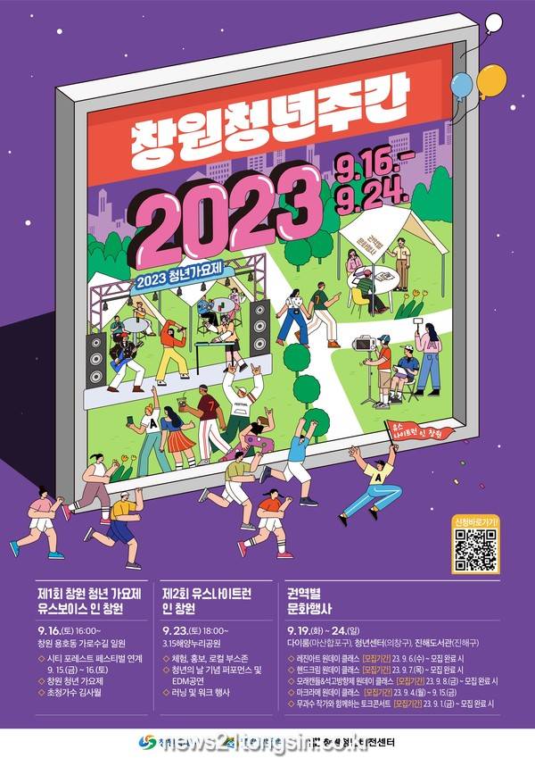 주요프로그램은 ▲창원 청년 가요제 ▲유스나이트런 인 창원▲(원데이클래스)레진아트, 핸드크림 만들기, 모래캔들&석고방향제 만들기▲무과수작가와 함께하는 북콘서트 등 청년들이 함께 할 수 있는 볼거리와 즐길거리를 제공한다.