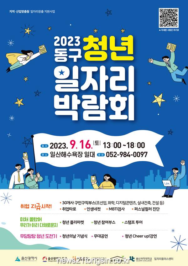 또, 동구 청년 일자리박람회도 열린다. 조선업, 화학, 디지털콘텐츠, 실내건축 등 30개사의 구인구직 부스와 퍼스널컬러 진단, MBTI검사 등 이벤트 부스가 운영되며 청년 참여자들이 직접 기획하고 만드는 청년프리마켓, SUP패들보드체험청년오락실 등 다양한 참여부스도 운영된다.