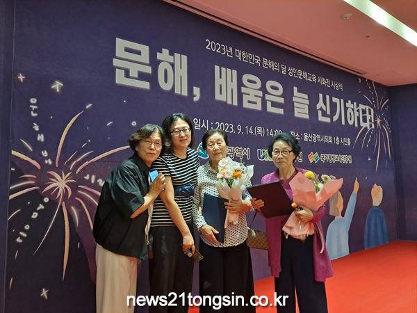(뉴스21통신/권혁진기자) = 울산 북구 찾아가는 한글교실 수강생 5명이 14일 울산시청 시민홀에서 열린 2023 성인문해교육 시화전 시상식에서 상을 받았다.