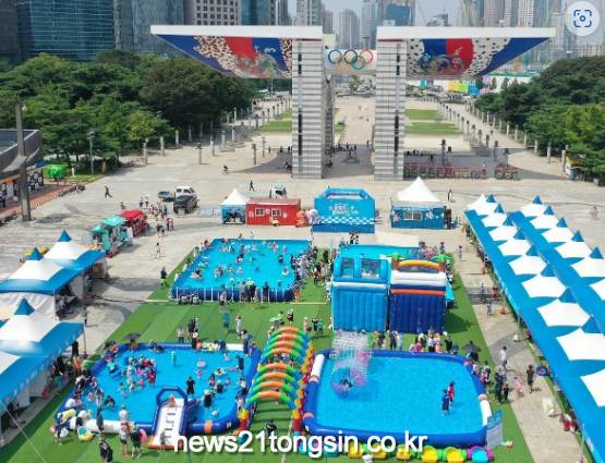 지난 7월 29일 구는 올림픽공원 평화의문 광장 일대를 가족 단위 주민을 위한 물놀이장으로 변신시켰다. 여름이면 햇볕이 강하게 내리쬐어 주민 방문이 줄어드는 공간에 풀장 5개와 슬라이드, 에어바운스, 그늘막 등을 설치하여 무료로 이용할 수 있게 했다.