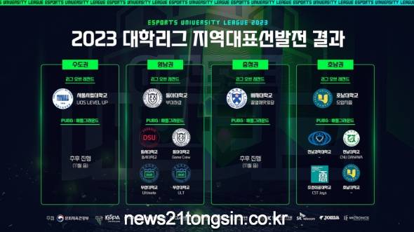한국e스포츠협회는 전국 이스포츠 최강 대학을 가리는 2023 이스포츠 대학리그의 수도·충청·호남·영남 4개 권역의 리그 오브 레전드 지역대표팀과 호남·영남 2개 권역의 PUBG:배틀그라운드 지역대표팀이 선발되었다고 19일(화) 밝혔다.