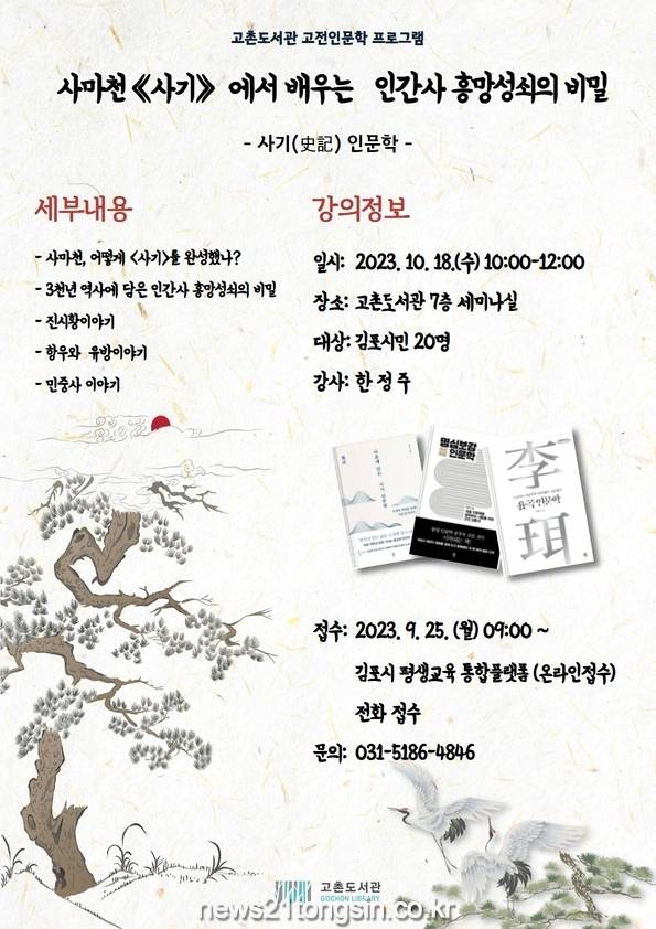 ▲ 사진=김포시김포시 고촌도서관은 10월 18일(수) 오전 10시부터 12시까지 7층 세미나실에서 “사마천 《사기》에서 배우는 인간사 흥망성쇠의 비밀”을 운영한다.