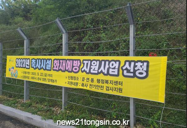 아울러 9월 말까지 추진 중인 「축사시설 전기 안전진단」 추가 접수를 위해 현수막 15개를 제작하여 8개 읍·면 행정복지센터에 배포·게시하였고, 유동 인구가 많은 여흥·중앙·오학동 지역 지정 게시대에 게시하였다.