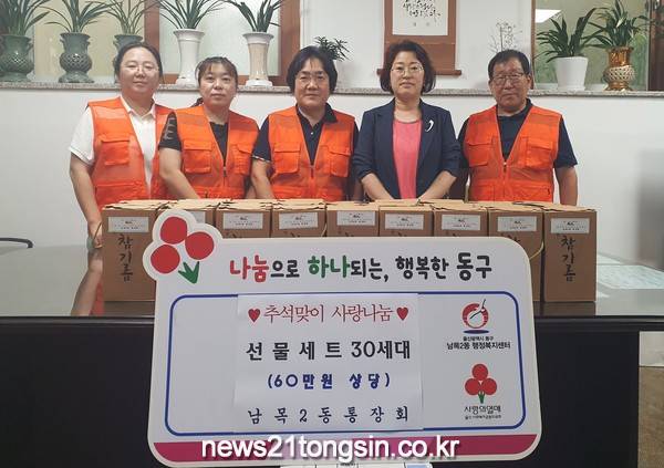 (뉴스21통신/임정훈기자) = 울산 동구 남목2동 통장회(회장 손점자)는 9월 20일 오후 2시 어려운 이웃들에게 전달해달라며 시가 60만원 상당의 참기름 30개를 기탁하였다.