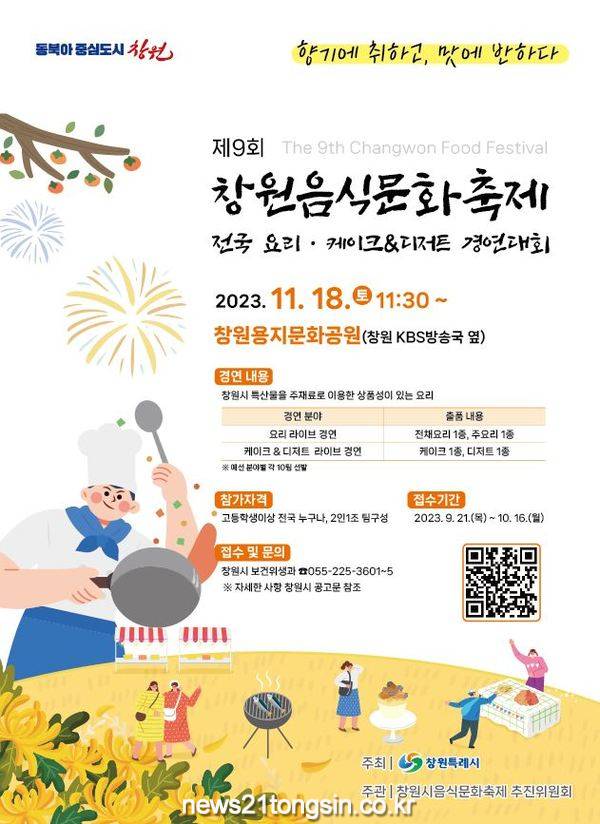 창원특례시(시장 홍남표)는 제9회 창원음식문화축제 전국 요리경연대회 참가자를 9월 21일부터 10월 16일까지 모집한다고 밝혔다.