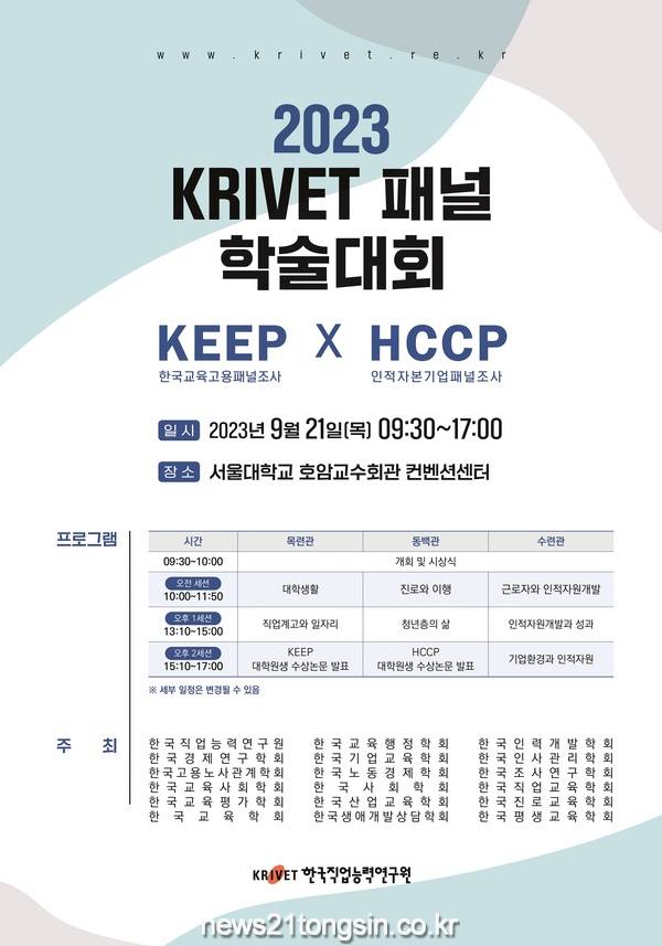 한국직업능력연구원(원장 류장수)은 9월 21일(목) 오전 9시 30분부터 ‘2023 KRIVET 패널 학술대회’를 서울대학교 호암교수회관에서 개최한다. 이번 학술대회는 ‘제18회 한국교육고용패널(KEEP) 학술대회’와 ‘제12회 인적자본기업패널(HCCP) 학술대회’가 함께 운영된다.