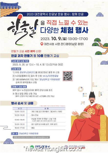 체험교실 사전접수는 9월 20일부터 QR코드 또는‘네이버지도’에서 ‘한남대학교 국어문화원’을 검색하거나 인터넷 주소(bit.ly/대전한글날)로 직접 접속하여 신청할 수 있다.