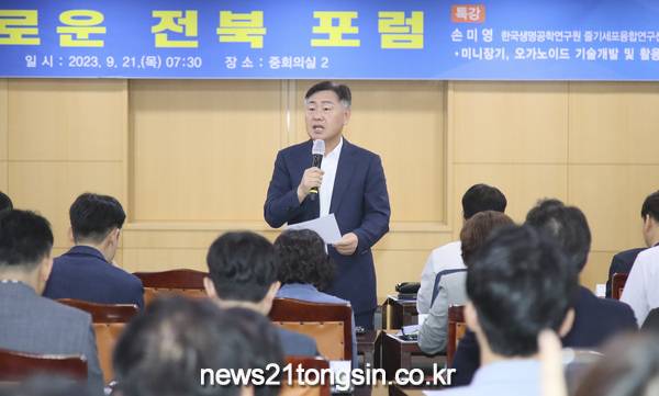 전북도는 21일 ‘9월 2차 새로운 전북 포럼’을 개최, 김관영 도지사가 아침 7시 30분부터 8시 50분까지 도청 중회의실에서 부지사, 실·국장 등 간부 공무원과 관련 출연기관장 및 직원 70여 명과 함께 ‘미니장기, 오가노이드 기술개발 및 활용 사례’라는 주제로 공부하고 열띤 토론을 진행하는 시간을 가졌다고 밝혔다.