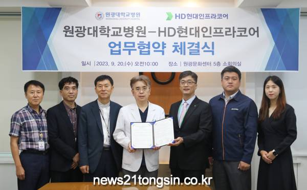 원광대학교병원(병원장 서일영)이 지난 20일 원 문화센터 5층 소회의실에서 HD현대인프라코어(주)(이하‘현대인프라코어)와 업무협약을 체결했다.