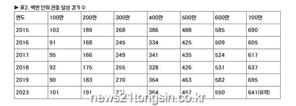2023 신한은행 SOL KBO 리그가 2019시즌 이후 4년만에 700만 관중 돌파를 눈 앞에 두고 있다.