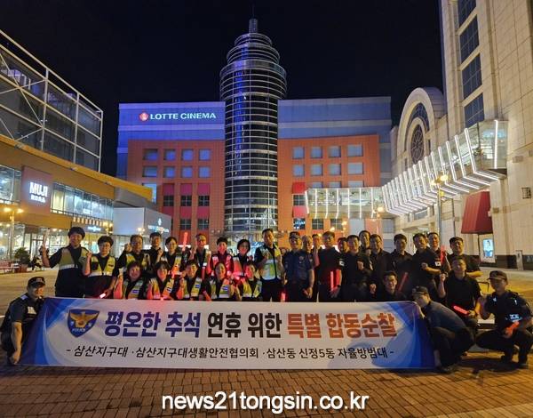 삼산지구대에서는 특별치안활동과 병행하여 안전한 추석 명절 분위기 조성을 위해 지난 22일 저녁 8시에 삼산지구대 생활안전협의회·삼산동·신정5동 자율방범대원 등 40여명이 참여한 가운데 삼산동 롯데백화점 일대 등 주요 상권을 중심으로 야간 합동순찰을 실시하였다.