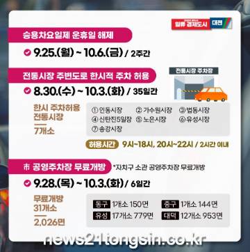 시는 9월 25일부터 10월 6일까지 2주간 승용차요일제 운휴일을 해제한다. 또한 연휴 기간에 시 공영주차장을 무료 개방하고, 전통시장 주변 도로에 한시적 주차를 허용하는 등 시민 교통편의 제공과 생활 불편 해소에도 적극 나선다.