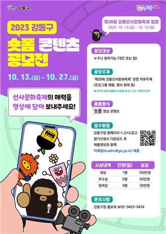 접수 기간은 10월 13일부터 27일 오후 6시까지 2주간이며, 제작한 숏폼 영상 원본을 신청서류와 함께 담당자 이메일(truelim@gd.go.kr)로 제출하면 된다. 신청서류는 강동구청 홈페이지 고시·공고에서 내려받아 작성하면 된다.