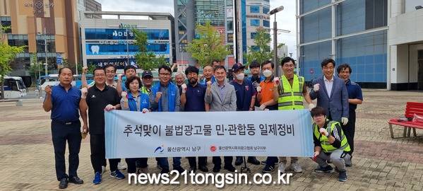 (뉴스21통신/최원영기자)=울산 남구(구청장 서동욱)는 추석 명절을 앞두고 오는 10월 1일까지 민․관 합동 특별정비반 6개 반 18명을 구성하여 주요 간선도로변 및 편의시설 중심으로 불법광고물 일제정비를 실시한다고 밝혔다.