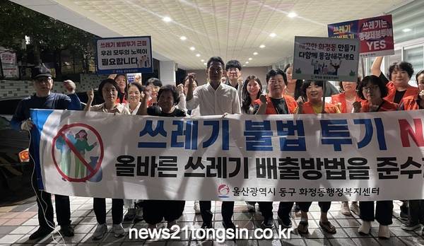 (뉴스21통신/임정훈기자) = 울산 동구 화정동 통장회 ‘화정깔끔이’회(회장 임영숙)는 지난 9월 21일 오후 8시에 공한지 등 환경취약지 일대에서 불법투기 야간단속 및 쓰레기 무단투기 근절 거리 홍보캠페인 활동을 실시하였다.