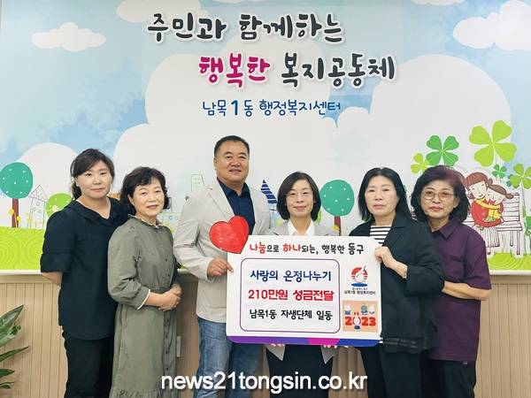 (뉴스21통신/임정훈기자) = 울산 동구 남목1동 9개 자생단체는 매년 생활이 어려운 관내 저소득 세대를 돕기 위해 명절마다 추진하는 ‘사랑의 온정 나누기’ 사업을 올해도 실시하고, 9월 22일 오전 10시 남목1동 행정복지센터에서 성금 전달식을 가졌다.