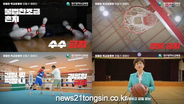 (뉴스21통신) 유재원기자 = 대구시교육청은 학교운동부 청렴도를 높이고, 교육감의 청렴 실천의지를 알리기 위해 교육감과 학교운동부 학생선수, 지도자 등이 직접 참여하는‘청렴한 학교운동부 만들기’캠페인 영상과‘학교운동부 분야 청탁금지법 바로 알기 Q&A’카드뉴스를 제작해 배포했다고 25일(월) 밝혔다.
