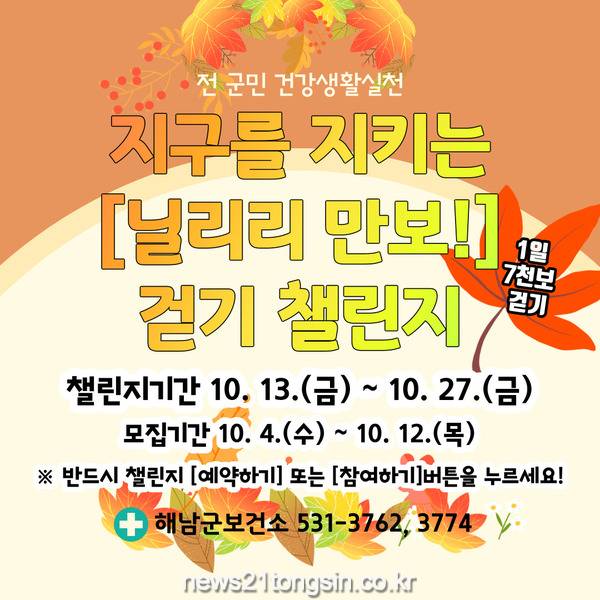 [뉴스21통신 박찬웅 기자] 해남군이 전 군민 걷기 챌린지‘닐리리 만보’를 운영한다.