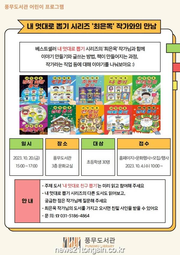 풍무도서관 문화교실에서 오후 3시에 개최되는 이번 작가와의 만남은 ‘책을 통한 즐거운 소통’이라는 주제로 진행되며 ▲‘내 멋대로 친구 뽑기’ 주제 도서와 내 멋대로 뽑기 시리즈 도서에 대한 이야기 ▲즐겁게 이야기를 만들고 글 쓰는 방법 ▲책이 만들어지는 과정 ▲작가라는 직업 등의 내용을 다룰 예정이다.