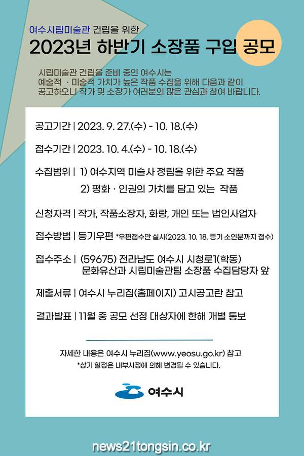 여수시는 공모를 통해 ▲여수지역 미술사 정립을 위한 주요작품 ▲평화·인권의 가치를 담고 있는 작품 등의 소장품을 확보한다는 계획이다.