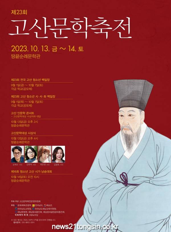 [뉴스21통신 박찬웅 기자] 올해로 23회째를 맞는 해남군 고산문학축전이 오는 13~14일 고산 윤선도유적지 땅끝순례문학관 야외무대에서 열린다.