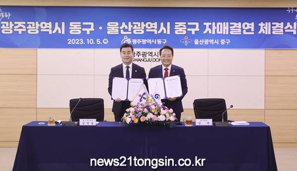 ▲ 동구-울산 중구 자매결연[뉴스21통신/장병기 기자] 광주 동구는 지난 5일 동구청에서 울산광역시 중구와 상호협력 및 상생발전을 위한 자매결연 협약식을 가졌다고 밝혔다.