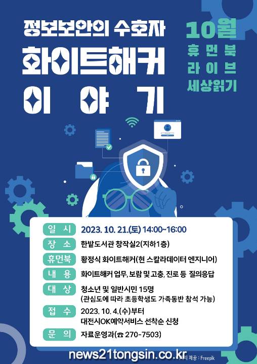 대전 한밭도서관은 21일(토) 오후 2시 한밭도서관 창작실2(지하 1층)에서 해킹 세계의 파수꾼 황정식 화이트해커가 들려주는 ‘휴먼북 라이브 세상읽기’를 진행한다.