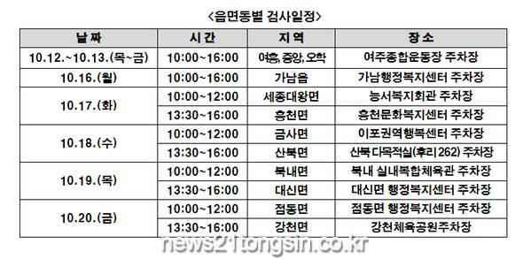 여주시는 여주 관내 이륜자동차에 대하여 한국교통안전공단과 함께 ‘찾아가는 이륜자동차 정기검사’를 10.12.(목)부터 10.20.(금)까지 7일간 실시할 예정이다.