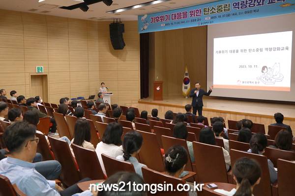 (뉴스21통신/임정훈기자) = 울산시 동구청은 10월 11일 오후 2시 동구청 5층 중강당에서 전 직원과 환경시민단체 등을 대상으로 ‘기후위기 대응을 위한 탄소중립 역량강화 교육’을 실시했다.