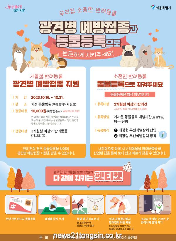 강서구 관계자는 “반려인과 반려동물의 안전을 위해 3개월령 이상의 개와 고양이는 반드시 1년에 1회 광견병 예방접종을 받아야 한다”라며 “성숙한 반려동물 문화 정착을 위한 동물등록제 참여와 접종 대기 시 목줄 짧게 잡기 및 맹견의 입마개 착용을 부탁드린다”라고 말했다.