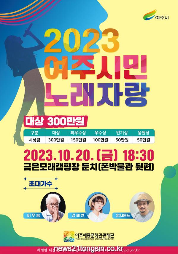 (재)여주세종문화관광재단에서는‘2023 여주시민 노래자랑’을 오는 10월 20일(금) 오후 6시 30분에 금은모래캠핑장 둔치(폰박물관 뒤편) 특설무대에서 개최한다.