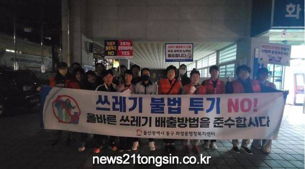 (뉴스21통신/임정훈기자) = 울산 동구 화정동 자생단체(통장회장 임영숙)는 지난 10월 12일 오후 8시에 공한지 등 환경 취약지 일대에서 불법투기 야간단속 및 쓰레기 무단투기 근절 거리 홍보캠페인 활동을 실시하였다.