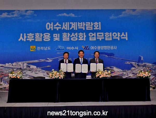 협약은 ▲박람회장 사후활용 종합계획 수립과 추진을 위한 재정 확보, 정책건의 및 행정지원 ▲지역발전을 위한 국내외 행사유치, 국제컨벤션센터 건립, 크루즈터미널, 랜드마크 조성 등 사업 발굴 ▲박람회장 사후활용 전문가 및 지역사회 의견 수렴 등의 내용을 담았다.