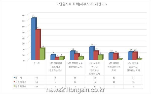 분야별로 살펴보면 ‘자유롭게 소통하고 참여하는 도시’ 영역에서 자원봉사 참여율(2.1%→3.8%)과 시민사회단체 조직률(4.9%→5.2%)이 상승했고, 초·중·고교 인권교육 참여율(15.1%→12.9%)은 하락했다.